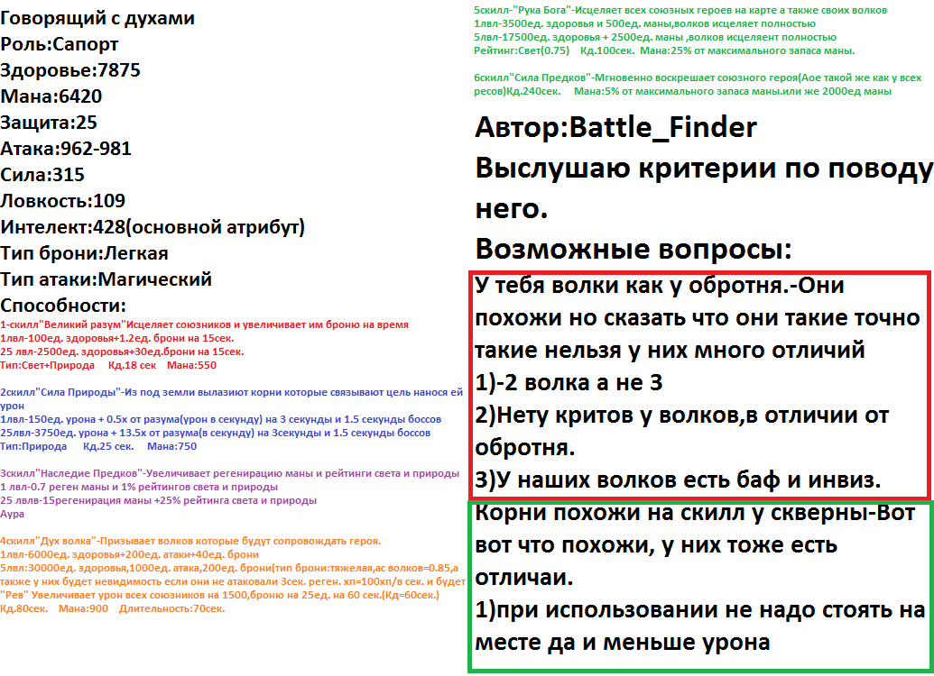 Хочу предложить нового героя: Название:Говорящий с Духами Роль:Великий сапорт 1-ый скилл: Великий разум. Активный 2-ый скилл: Сила Природы. Активный 3-ый скилл: Наследие предков. Пассивный 4-ый скилл: Дух волка. Активный 5-ый скилл: Рука Бога. Активный 6-ый скилл: Сила Предков. Активный. Он может носить: Тома,Посохи,Манускрипты и т.д. P.S.